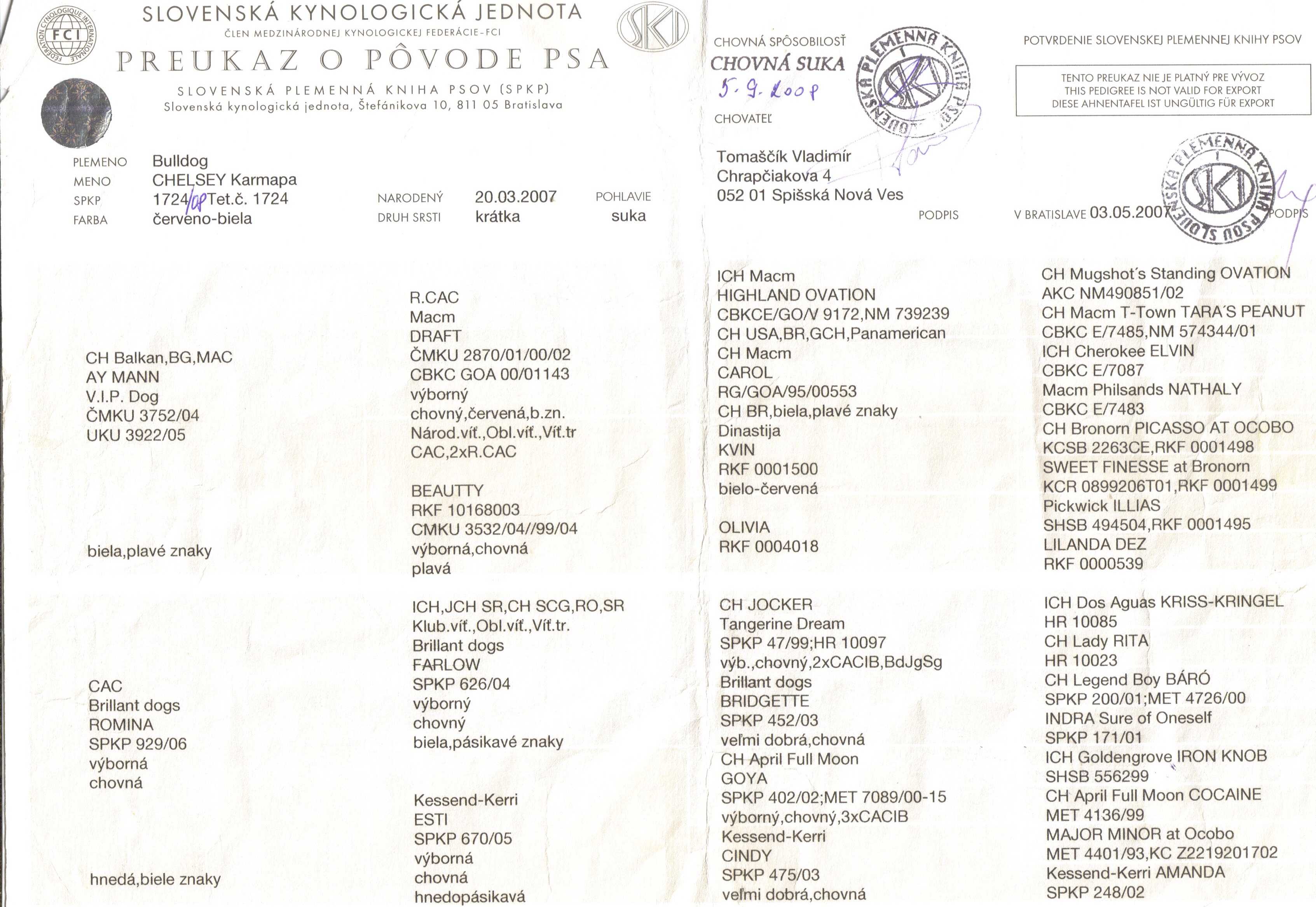 Chelsinka je náš miláčik, je veľmi temperamentná, aportuje, pláva, dokonca hryzie do rukáva, miluje každú spoločnosť a je veľmi starostlivá matka.